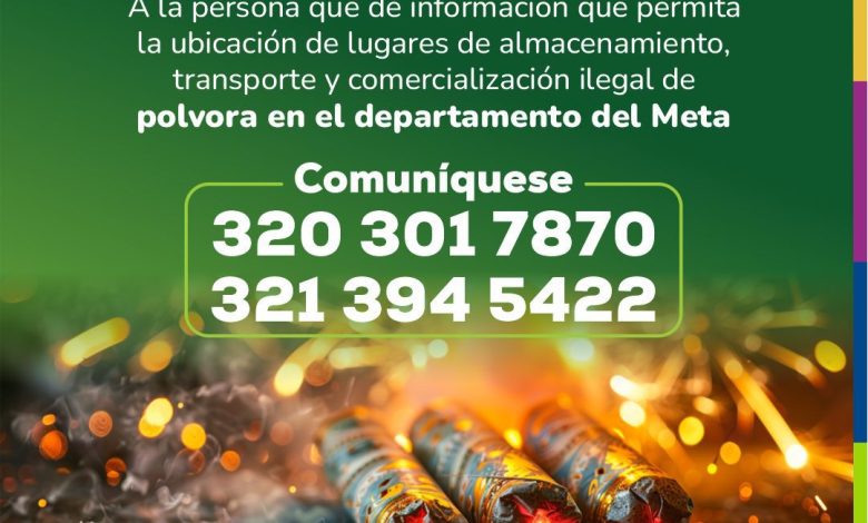 La Gobernación del Meta, aprobó una recompensa de hasta 15 millones de pesos para quienes suministren información que permita identificar lugares de almacenamiento, transporte o comercialización ilegal de pólvora en el departamento.
