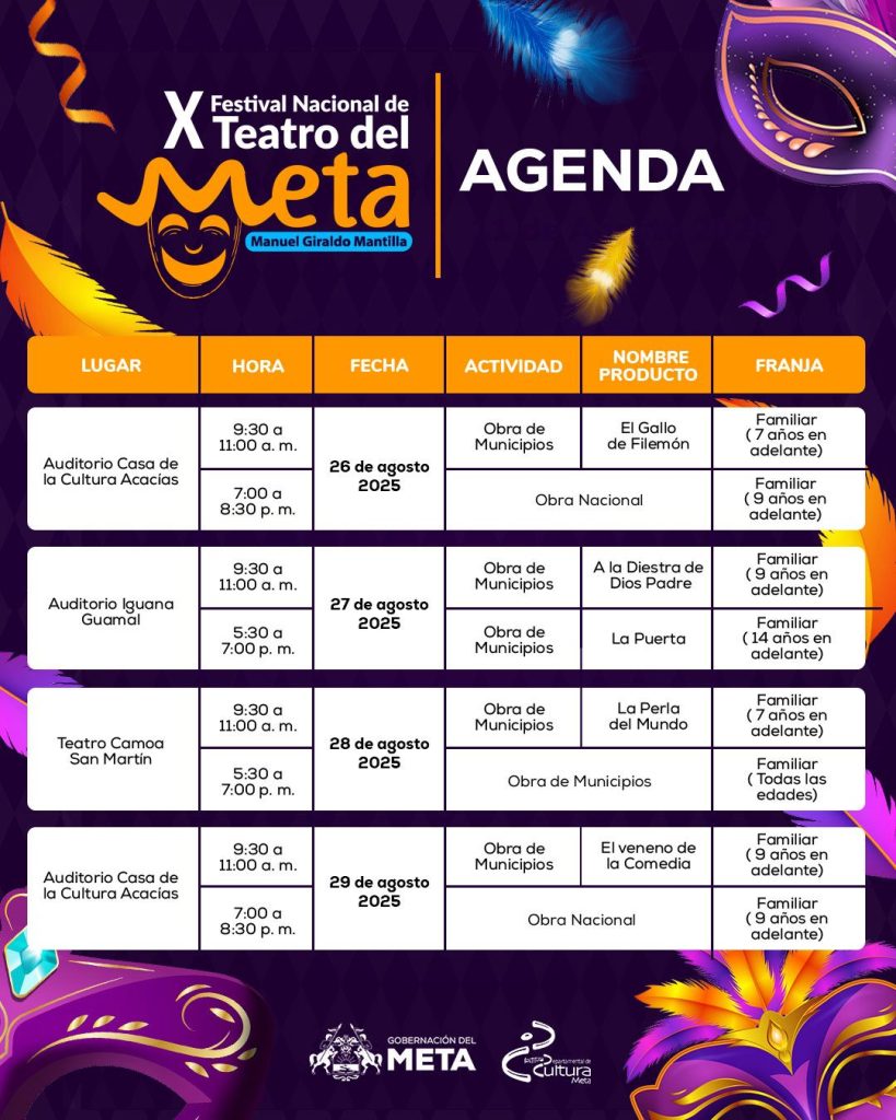 Bajo el lema ‘¡Crea, imagina y actúa!’, esta décima edición reunirá el talento de obras nacionales y municipales, ofreciendo una programación diversa para públicos de todas las edades. Los escenarios serán el auditorio de la Casa de la Cultura de Acacías, el auditorio Iguana, de Guamal y el Teatro Camoa de San Martín, donde los asistentes podrán disfrutar de montajes familiares y propuestas teatrales que reflejan la riqueza cultural del país.