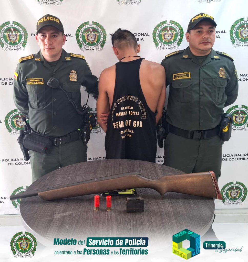 Mediante labores de patrullaje por la carrera 42 con calle 70, las autoridades observaron a este sujeto que llevaba en su espalda una lona y, al practicarle un registro, evidenciaron que ocultaba esta arma de fuego tipo escopeta con un proveedor y dos cartuchos calibre doce milímetros. Al solicitarle la documentación que acreditara la legalidad del arma de fuego, manifiesta no contar con los permisos para su porte o tenencia.