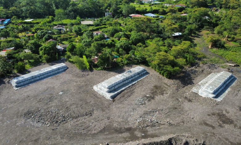 El proyecto contempló la construcción de tres espolones de 30 metros lineales cada uno, diseñados con un sistema estructural de geocontenedores rellenos y recubiertos con geomembrana impermeable e inyección de concreto fluido tipo flexocreto, lo que garantiza mayor resistencia, flexibilidad y durabilidad frente a la fuerza hidráulica del río.