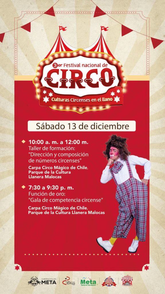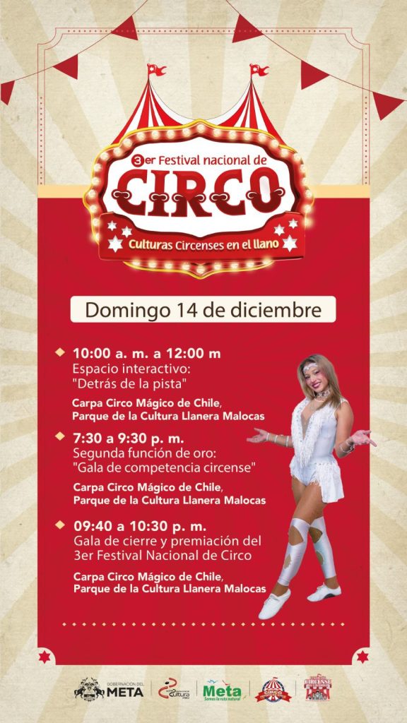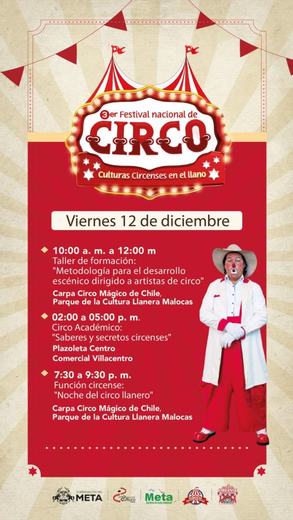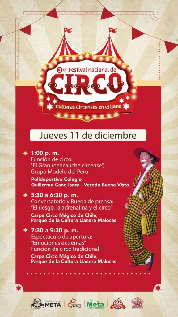 En el marco de la estrategia “Meta Mágico”, que busca promocionar turísticamente al departamento, en esta temporada decembrina, el Instituto de Cultura del Meta, anuncia la realización de la tercera edición del Festival Nacional de Circo “Culturas Circenses en el Llano”, del 11 al 14 de diciembre en la carpa del