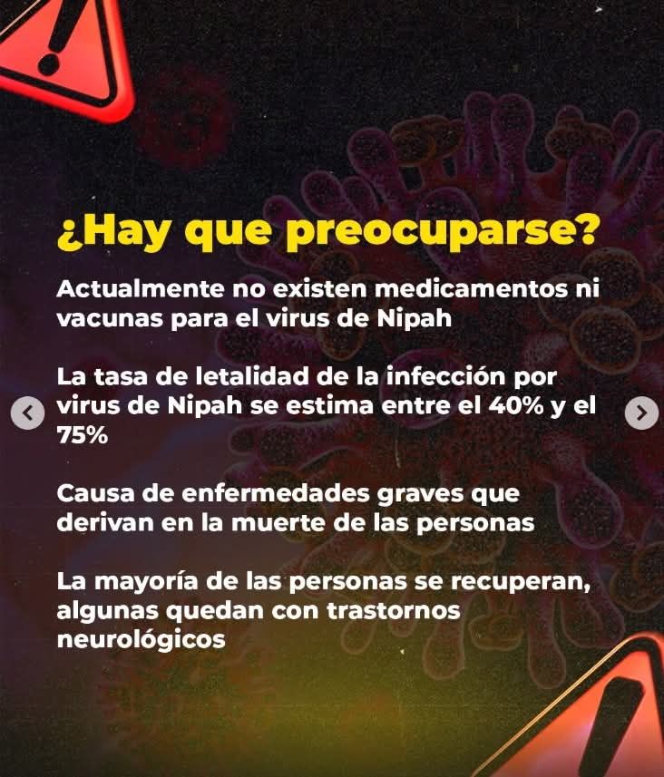 El Nipah está clasificado por los CDC como un virus de nivel cuatro de bioseguridad, la categoría más alta, al mismo nivel del ébola. No existe vacuna ni tratamiento específico, y su potencial de transmisión entre humanos lo hace especialmente preocupante.
