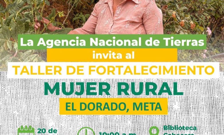 La Agencia Nacional de Tierras —ANT— realizará el ‘Taller de Fortalecimiento Mujer Rural’, un espacio diseñado para ampliar el acceso a la información, promover la participación activa y fortalecer el liderazgo de las mujeres campesinas, en el municipio de El Dorado, Meta.